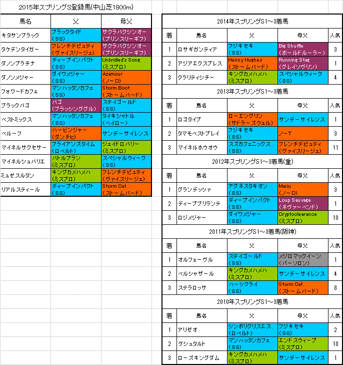 3月22日(日)に行われるスプリングステークス2015の出走予定馬と過去5年の1~3着馬の血統を、予想に役立つ見やすい色分け出馬表にまとめました。スプリングステークスと中山芝1800mの血統データを分析します。 続きを読む