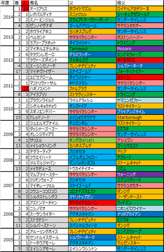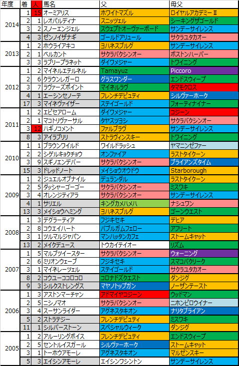 全体で見るとサクラバクシンオーには見劣るが、ノーザンダンサー系は爆発力で勝負という感じ。昨年はオーミアリスがノーザン同士の配合(リファール系×ニジンスキー系)で15番人気での爆発勝利。他にも12番人気3着ハギノコメントは父ファルブラヴ。一昨年のホウライアキコからここ2年は連続してノーザン系の勝利である。馬場の傾向的にはここ2年の傾向に今年も近い形なのでバクシンオーの傾向も重要だがこのイメージも持っておきたい。割と万遍なく来ている印象だが、これも短距離型が明確に強い。ラストタイクーンやファルブラヴ、スニッツェルあたりが来ているが、近年は馬場が良い状態で最終週になるので、ストームキャット系とか比較的軽い芝でやれる馬も警戒しておきたい。