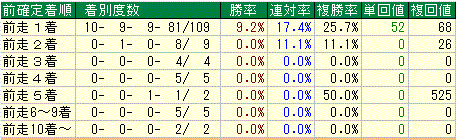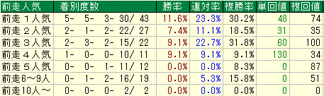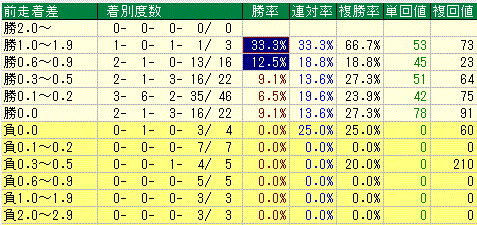 前走1着馬が殆どなんですが、人気に関しても高い支持を受けた上で好走した馬ばかり。着差に関しても勝率が高いのは前走圧勝の馬。