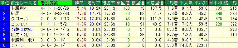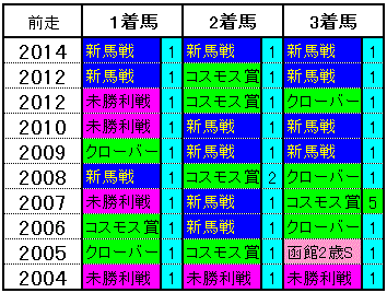 コチラも似たような成績ですが、3着以内馬は全て札幌からの臨戦馬。4/6頭は1人気で1着、いずれも2着馬にキッチリ着差を付けての完勝です。