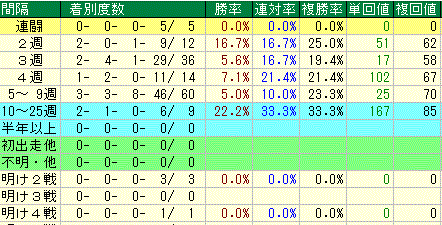 同じ札幌からの馬が中心なんですが、函館のレースから間隔を空けた馬の成績がイマイチなのは気になりますね(^_^;)