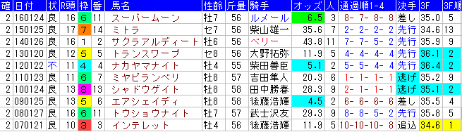 | 4歳 | 1- 2- 1- 13/ 17 | 5.9% | 17.6% | 23.5% | 18 | 55 |