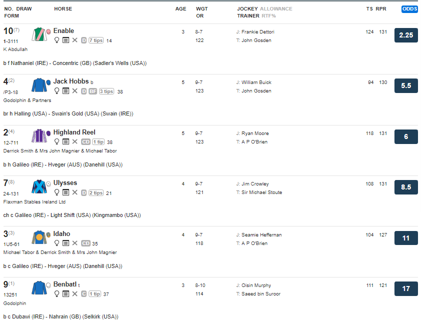 1番人気は3歳牝馬、英・愛オークス圧勝のEnable(イネーブル)。