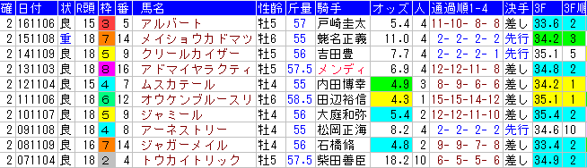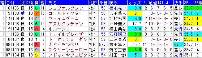 | 2016/11/6 | 良 | 15 | 6-7-6-5 | 11-10-8-8 | 9-11-11-11 | 02:33.4 |