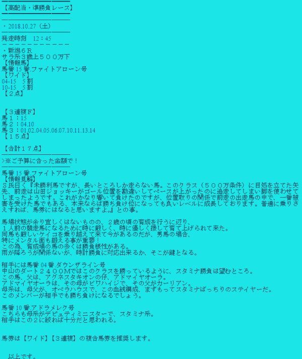 的中は土曜・新潟6Rに出走した単勝12番人気のファイトアローン号