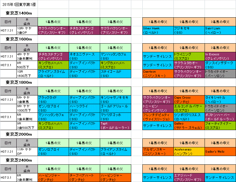 が行われる東京芝コースの1~3着馬の血統データを、予想に役立つ見やすい色分け表にまとめました。