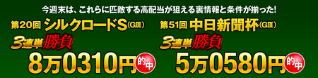 今週はこのW重賞3連単情報を、何とどちらも無料公開させていただきます。以前に当サイトの情報で万馬券的中を掴んだ方も、この特別なチャンスをぜひお見逃しなく。