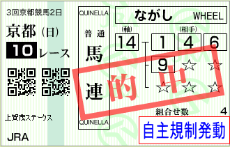 京都10Rの馬連馬券は【購入額自主規制発動】とさせて頂く事にしました。