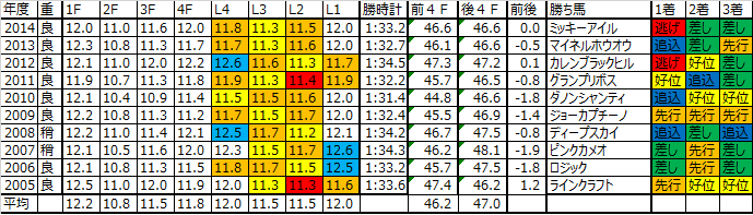 まずレース全体のペースだが、基本的にスローにはまずならない。近年のケースでも10年前のラインクラフト以降はほとんどが平均ペース以上の流れになっているので、良馬場ならまずスローの可能性は低いとみて良い。まあこれはやはり1400路線のスピードタイプも参戦することが多いし、マイルがちょっと長い馬でも現状目標がないという3歳スプリント路線の整備がないというのが大きな要因になるのかなと思う。その点で1400でスピードを活かしてくるタイプが結構先行してペースを引き上げることも多く、またマイル路線の逃げ馬が目標にされてペースが上がるという傾向が強い印象。いずれにせよ基本的にペースは上がりやすい。