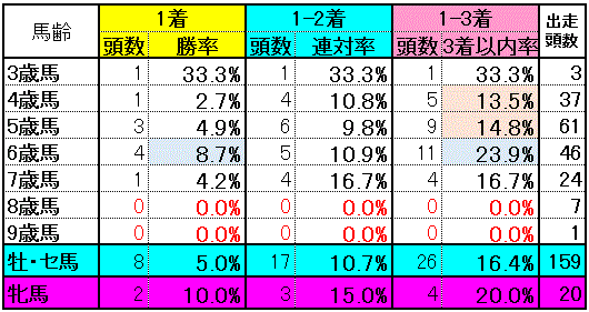 年代はかなりバラついた実績ですが勝率が高いのは6歳馬。一番活きが良い筈の4・5歳馬の好走率の悪さが目立ちますね。