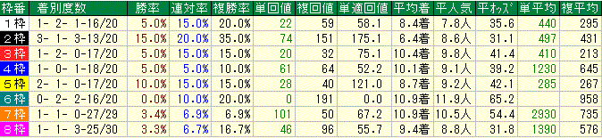 全体的にはあまり偏りが見られませんが、5番ゲート以内から5頭の勝ち馬が出るなど勝ち馬はやや内寄り傾向。