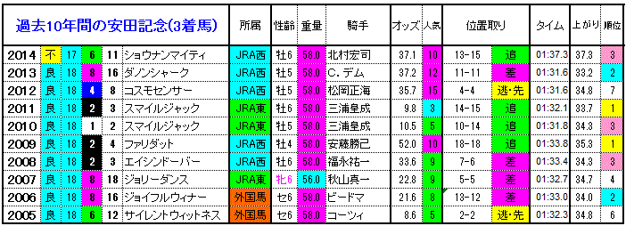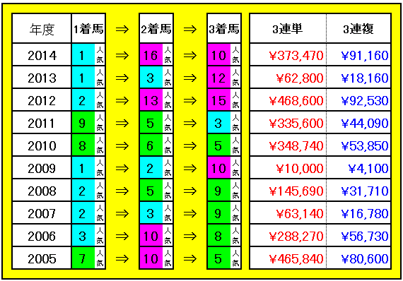 オッズ4倍未満に支持された馬は10年間でわずか5頭とかなり人気が割れやすいレース。今年もそんな感じのメンバーですが・・・ とりあえず2・3着付の馬は中途半端に人気がある馬よりは10倍~30倍あたりの穴に手広くながした方が良さそうですね(^_^;)