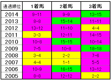 逃げ・先行馬は苦戦傾向。後方からの追込みは届かずの2・3着が多く、中団からの差し馬が好成績。