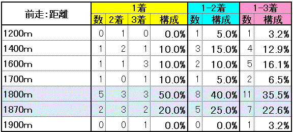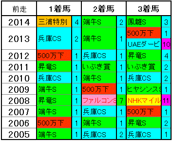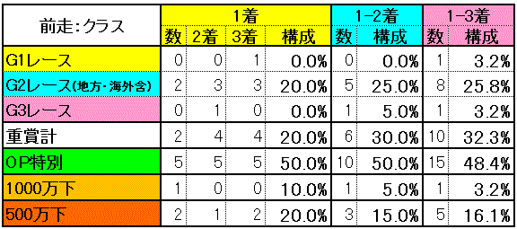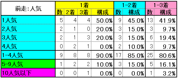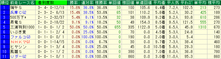 数で全体の半数を占めるのはOP特別からの臨戦馬。数・率共に優秀なのが交流重賞(兵庫CS)からの馬。海外だった馬は該当馬が一頭のみなので何とも(^_^;)(ケイアイレオーネ3着)