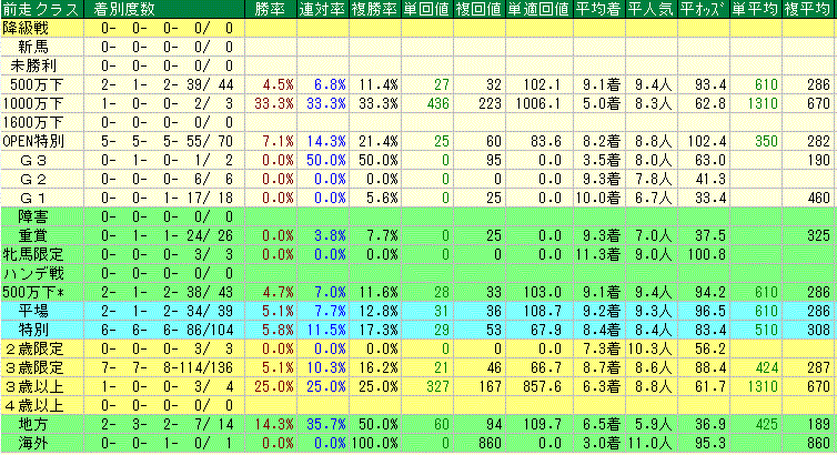 上位人気だった馬、上位着順だった馬が断然。勝ち馬はクラス問わず8/10が前走1着馬でいずれも3人気以内に支持されていた馬。大敗からの巻き返しは芝からの臨戦馬だったり、前走海外だった馬なので適条件からの巻き返しは殆ど見られません。