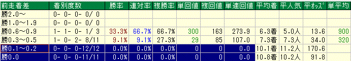 馬券に絡んだ馬は全て0.4差以上の着差を付けて完勝だった馬。今年の該当馬はピンストライプとダイワインパルスの2頭のみ。馬券に絡んだ該当馬は1600・1800mのいずれかだったので戦績的に近いのはダイワインパルス。