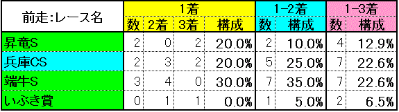 数・率共に優秀なのは兵庫CS・端午Sの2レース。2頭の優勝馬を出しているものの昇竜Sからの馬は連対率がイマイチで凡走も多いようです。