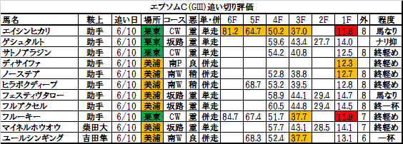 …頭は高いし、追い出されてからの反応は若干鈍いんだけど、この馬としてはエンジンがかかってからは前肢の捌き鋭く力強い走りで余力を持って楽に伸びてきたのは好感。もともと追い切りで目立つ馬じゃないのでこれは幾らか怖い材料かな。