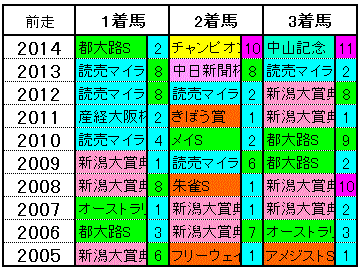 数では新潟大賞典からの臨戦馬が多めですが、マイラーズCからの臨戦馬は【3-2-1-3】と好走率がずば抜けて高めで回収値も大きくリード。次に多い都大路Sは2009年まではハンデ戦1600mとして行われていたので何とも言えませんが、昨年はここからディサイファが優勝しています。近年はG2からの臨戦馬がコンスタントに連対又は3着以内に入線している点は見逃せません。