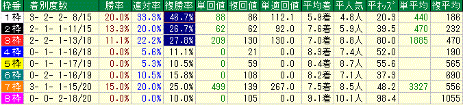 1・2・3枠から7頭の優勝馬が出るなど内寄りの枠が好成績。特に1枠に関しては出走馬の半数近くが馬券に絡んでるんですが、人気の先行馬だとかなり信頼度が高いようです。