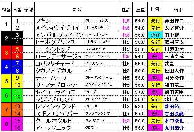 今年のメンバーの中で勢いがある馬、となると連勝でオープン入りとなる9番ティーハーフ。近走は以前ほど位置取り悪くなく、今ならここでもやれそうな感じ。