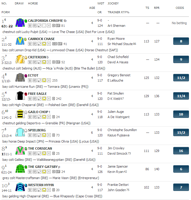 | 6 | CALIFORNIA CHROME | - | Art Sherman | chestnut colt Lucky Pulpit (USA) — Love The Chase (USA) (Not For Love (USA)) |