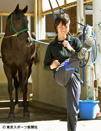 「エイ」と気合を入れる空手初段の藤田騎手候補生