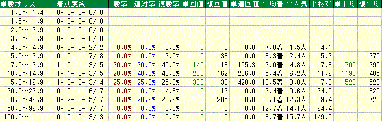 勝率12.5%、連対率25.0%、複勝率37.5% 単回値62、複回値79