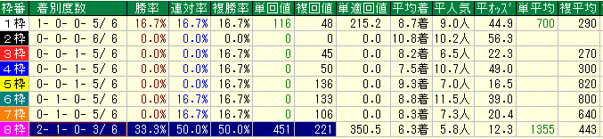 平地・後方 2- 0- 0-10/12 16.7% 16.7% 16.7% 185 67