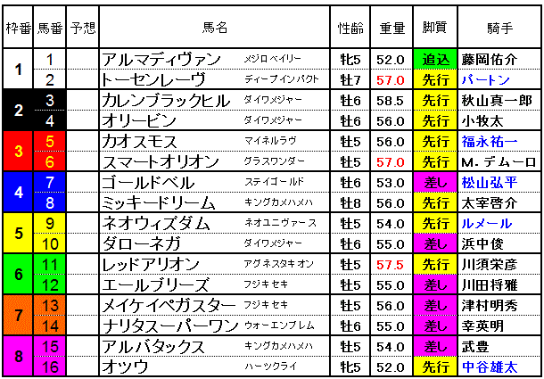 G1を勝っている2枠3番カレンブラックヒルが格的には上位の存在。最終週でやや荒れた馬場も向きそうなんですが、ハンデ頭の58.5㌔でソコソコ人気を背負うことになりそう。積極的に買いたい感じではないですね。