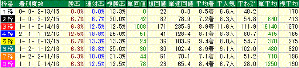 3連勝中と勢いのあるティーハーブは5枠10番。前走の派手な勝ちっぷりから嫌ってみたくなるんですが、データ的にはこの馬はあまり死角が無いんですよね(^_^;) サマースプリントSではベルカントがアイビスSD→北九州記念と連勝して現在トップ。そのベルカントはスプリンターズSに直行する予定なのでこの馬がここを勝ってセントウルSに出走すればこの馬が王者になることになりますね。