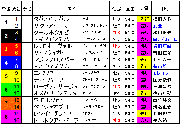 ちょっと不気味なのが6枠12番のオメガヴェンデッタ 条件戦を勝っての臨戦は同厩のレッドオーヴァルと同じ。ゼンノロブロイ産駒のコース実績はイマイチですがそのレースで負かしたエポワス(5枠9番)はその後にオープン勝ちしていますし、ソコソコやれそうな感じも。