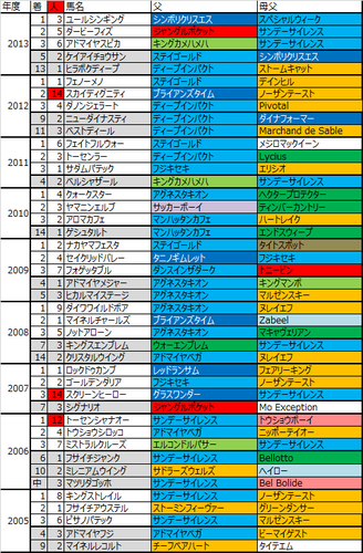 次に全体的にインパクトが大きいのがロベルト系だろう。14番人気で2度馬券に絡んでいるというのも穴党にとっては目が離せない血統だ。ちなみにサンデー系関連が8勝しているが残りの非サンデー系の1勝がロベルト系×ノーザン系という配合。逆に言えば勝ち馬全てどちらかにロイヤルチャージャー系が入っているということで、このレースは非常にロイヤルチャージャー系が強い。スクリーンヒーローは14番人気3着、スカイディグニティも2着と父系としては活躍している。ただ母系に入っては2度人気を裏切っているので注意が必要だろう。サンデーとのロイヤルチャージャー系同士でもスクリーンヒーローは馬券に絡んでいるので何ともだが、この人気を裏切った2頭はどちらもサンデー系種牡馬との配合になるので一応マイナス要素としては考えておいた方がいいか。