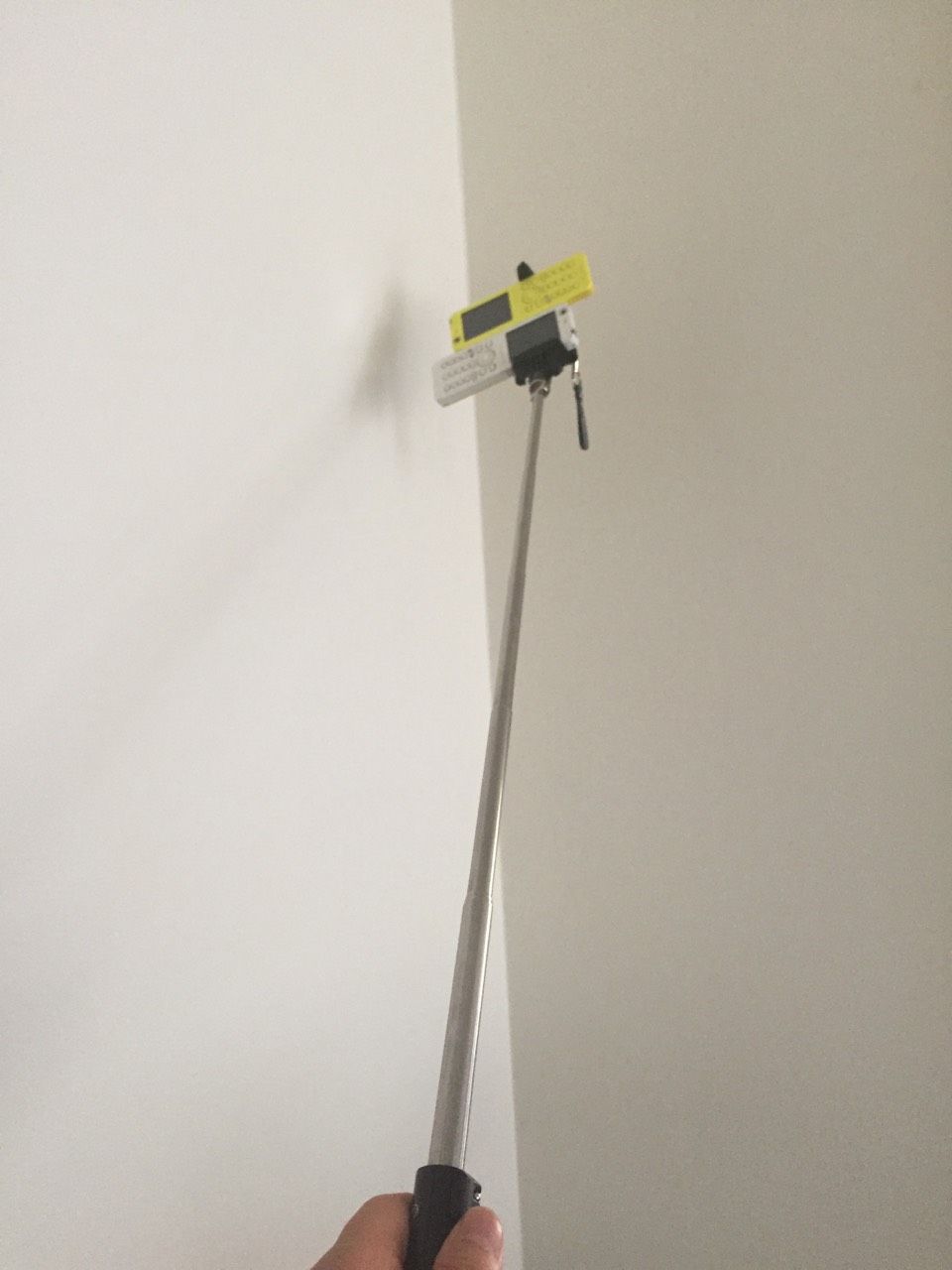 bluetoothでつなげば手元のボタンで撮影ができるので、棒が付いたドローンのような使い方もできます。興味のある方は是非お試しあれ。なお、何か挟まないと絵にならないので古いウィルコムを挟んでみました…。