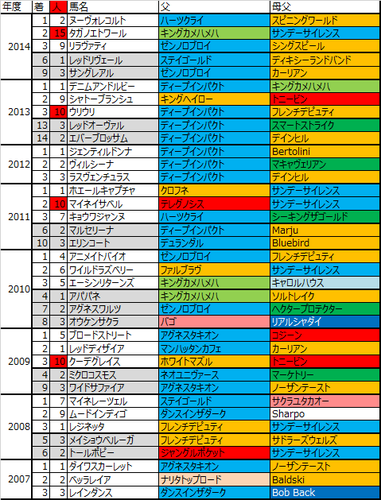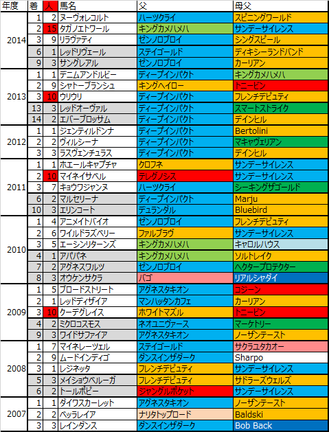 ひとまずサンデー系は強い。父サンデー系じゃなければ母父にサンデーサイレンスという馬が上位に多くいて、人気を裏切るケースももちろん母数が多いのであるのだが、勝ち馬に限れば過去8年で父母父共に非サンデー系という馬は実はいないし父サンデー系が7勝、唯一の例外もホエールキャプチャ(父クロフネ)で母父サンデーである。2着まで含めても14/16でサンデー系が絡んでいるわけで、サンデー系を軽視することは無理である。