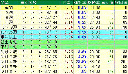 3週以内の詰まった間隔の馬からは連対ナシ。3着にも2頭と好走率は×