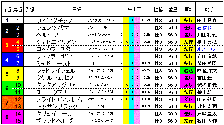 ダービー未出走組で注目は2枠3番のベルーフでしょうか。京成杯勝ち馬でスプリングSでも差のない4着と中山は好相性。1度使われている強みもあります。