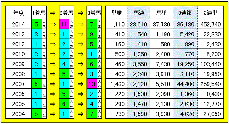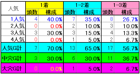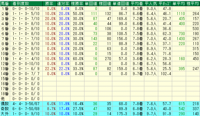 1人気は4-3-1-2となかなか優秀^^ 優勝馬10頭中9頭が1~5人気で占められるなど1着は割と堅い傾向。2着馬も似たような感じで3着以内馬30頭で6人気以下の馬の食い込みは8頭とやや少なめ。