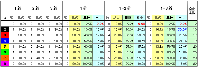 勝ち馬の配置はほぼフラット。最内の1枠は1頭も3着以内馬が出ていませんが、この枠で人気になったのは昨年のフォワードカフェ(2人気)ぐらい。隣の2枠は出走馬の半数が馬券に絡むなど好調ですし、内がイマイチなわけでは無さそう。