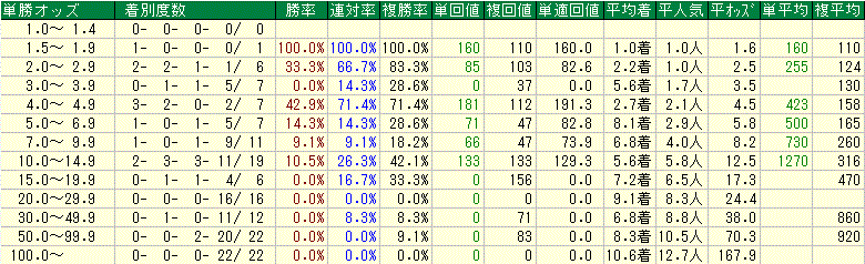 牝馬 0-1-3-20 勝0.0% 連4.2% 複16.7%