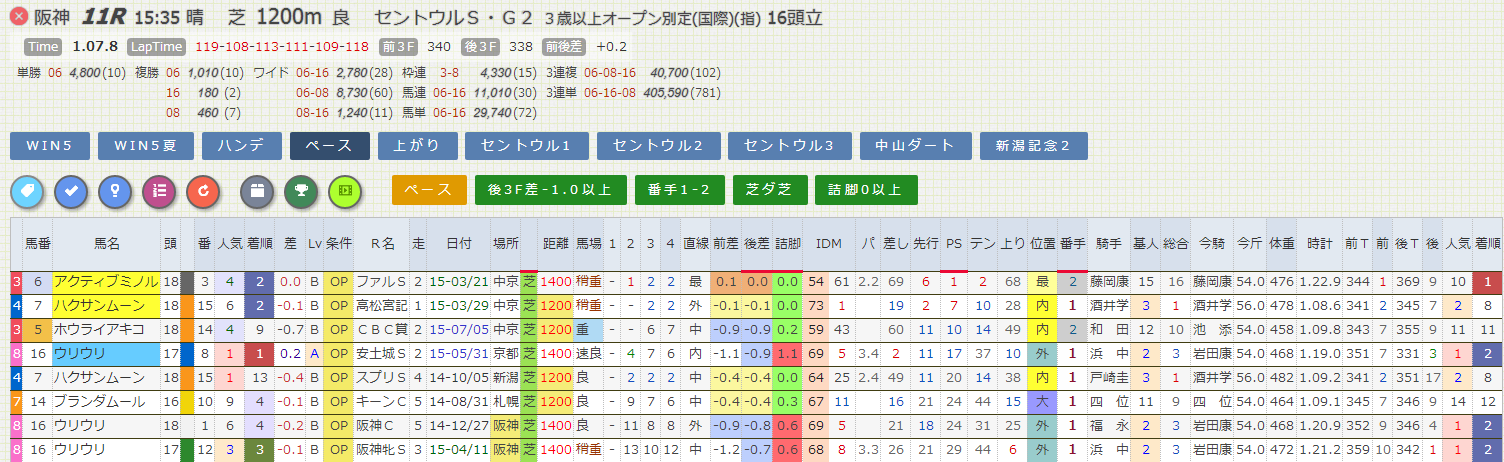 先週のセントウルS用では「差し馬」系のフィルタが上位でした。