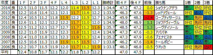 まずは全体のペースから見て行きたい。ここから見ても±0.7の範囲内が過去5回で半数以上が平均ペースということになる。-1.5までの範囲、ややハイペースが2度で超ハイが一度。つまり過去9戦のうち7度が平均ペース以上では流れているということでひとまずはペースが上がりやすいレースだという認識が必要だ。絶対的な前半4Fは概ね47秒前後に収束するが、年末の阪神ということからこのペースだと後半が47秒を切れないという感じで結局平均ペースになってしまうという感じかな。48秒台でもややスロー程度で落ち着くことがほとんどで、馬場が重ければ基本的には平均以上で流れる可能性が高いとみていいだろう。