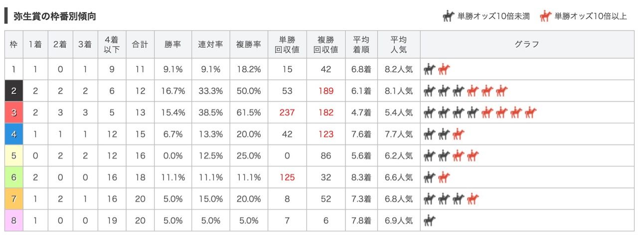 6枠・8枠は1着馬が出ていますが、2・3着の馬は出ていないので複勝率が低いようです