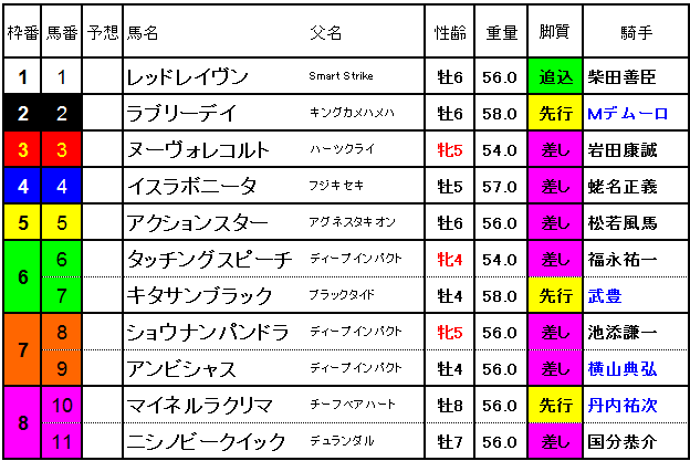 少し間隔が空いたのが8番のショウナンパンドラ それでも有馬記念をムリして使わずにパスした点には好感が持てますね。牝馬で最も重い56㌔の斤量が心配材料。