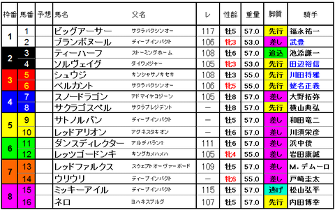 1人気が濃厚なビッグアーサーは1枠1番へ。ロードカナロア以来のスプリントG1春秋連覇に期待がかかります。そのロードカナロアですら前哨戦のセントウルSを余裕残しでは勝ち切れなかった点からもこの馬の今の充実ぶりを感じます。この秋のトレンドは「1人気馬の優勝」ですし、ちょっと逆らいづらい状況ですね(^_^;)