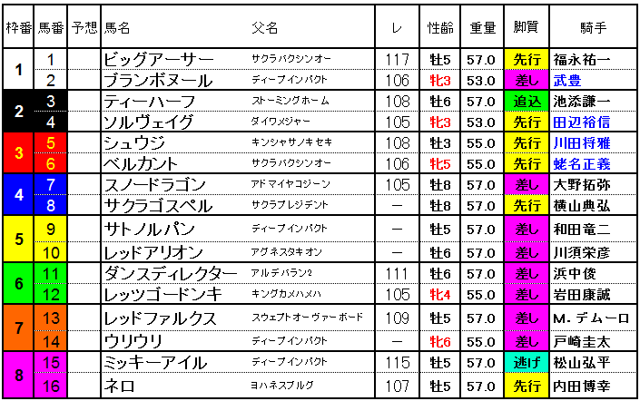 そのディープインパクト産駒でもう一頭気になるのが1枠2番のブランボヌール 母父がサクラバクシオーという事でなんか間を取ったみたいですね(笑) 3歳馬の実績はイマイチですが、前走の勝ちっぷりがあまりにも鮮やかだったので未知の魅力がありますね。