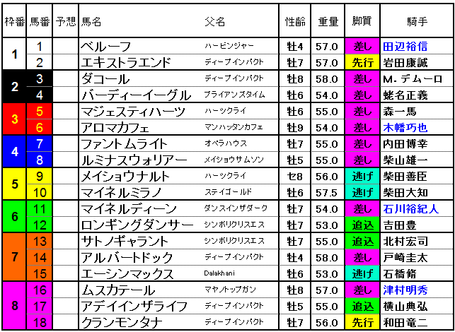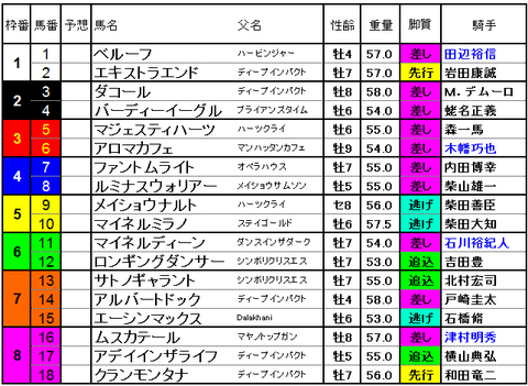 5枠10番のマイネルミラノは昨年の2着馬。今回は同型が何頭かいますし、今回はマークされる立場での出走。せめて馬場の味方でもあれば良いのですが・・・