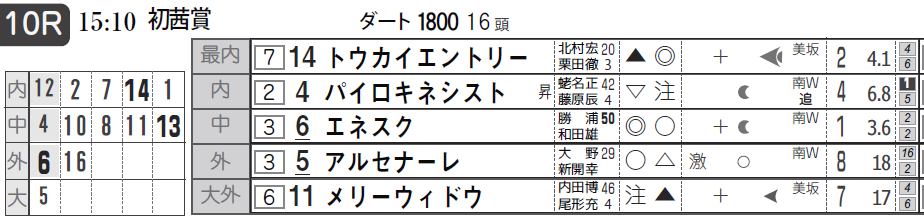 馬名の後には、降級・昇級初戦・格上挑戦の印。