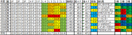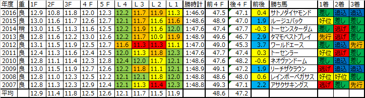 脚質は面白くて、逃げ馬が5連対、重賞でこれだけ逃げ馬が連に絡むというのもなかなかないというぐらい逃げ馬が強い。前述にもつながるが、後ろから行く馬と前から行く馬で全く別の競馬になることもしばしあるし、展開の利によっての逃げ残りは警戒が必要。1着馬に限れば追込み過ぎると届かない、ある程度の位置からしっかりと脚を引き出せる馬が理想。2着まで来ると差し、追込み天国になっているので基本的にはトップスピードの質、持続力を持っている馬を優先でいいだろう。そのうえでポジションを取れる馬の優先順位を上げていくという感じで良いかな。
