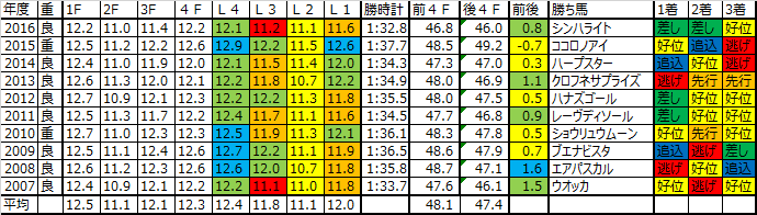 まずは全体のペースだが極端にはなりにくいなという感じ。過去10年を見ても1.6秒でかなりのスローが一度だけ。後はややスロー4度、~平均5度の範囲で収まっているように前半のペースはそこまで上がってこない傾向が顕著に出ていると。大体48秒ぐらいなので、ハロン12をクリアできていればまず大きな問題はない。